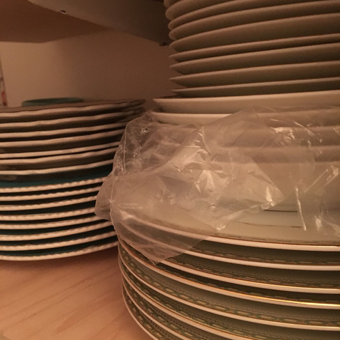Platters, dishes and old wine bottles that we use for water when we entertain all organized here. The white containers make it easier for me to get dishes in and out of the closet.